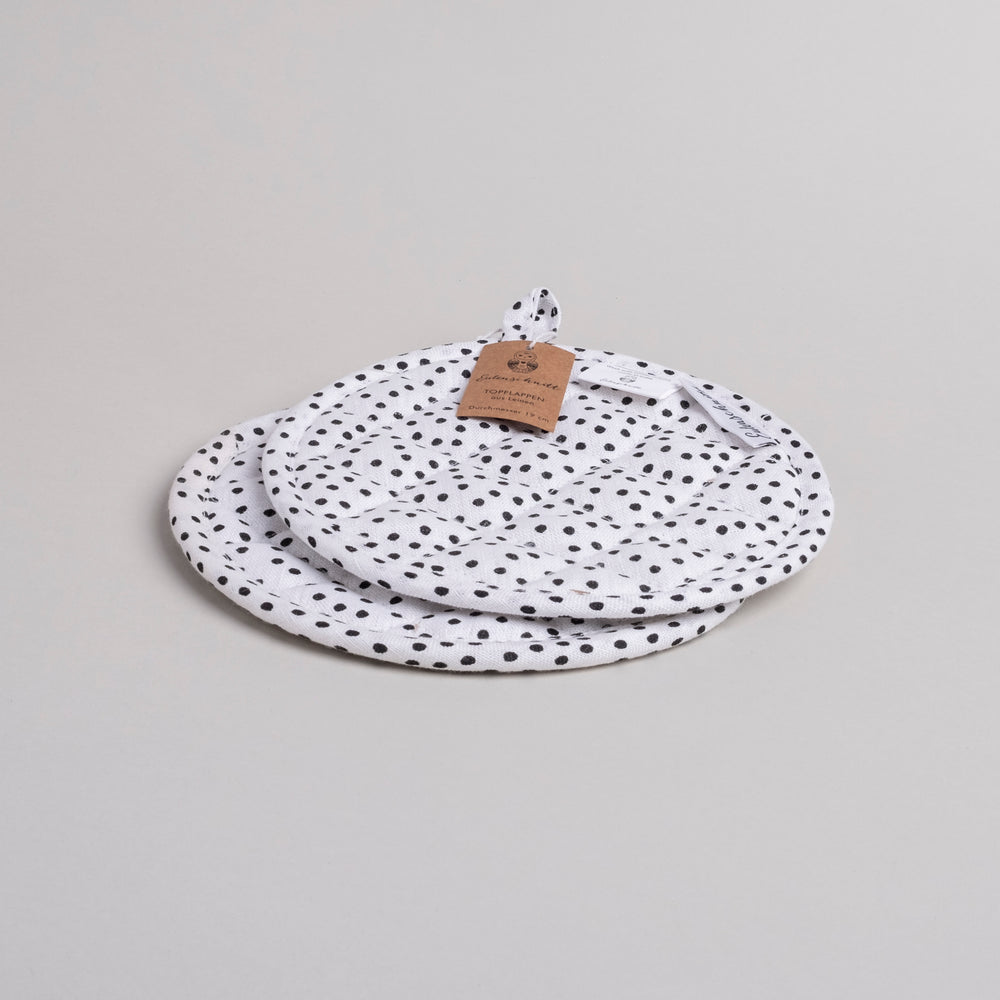 Der Topflappen „Punkte“ von Eulenschnitt aus hochwertigem Leinen sind praktische Helfer und stilvolle Hingucker in jeder Küche. Das minimalistische Design mit runder Form verbindet Funktion und Ästhetik – perfekt zum Anfassen heißer Töpfe oder als dekoratives Detail.