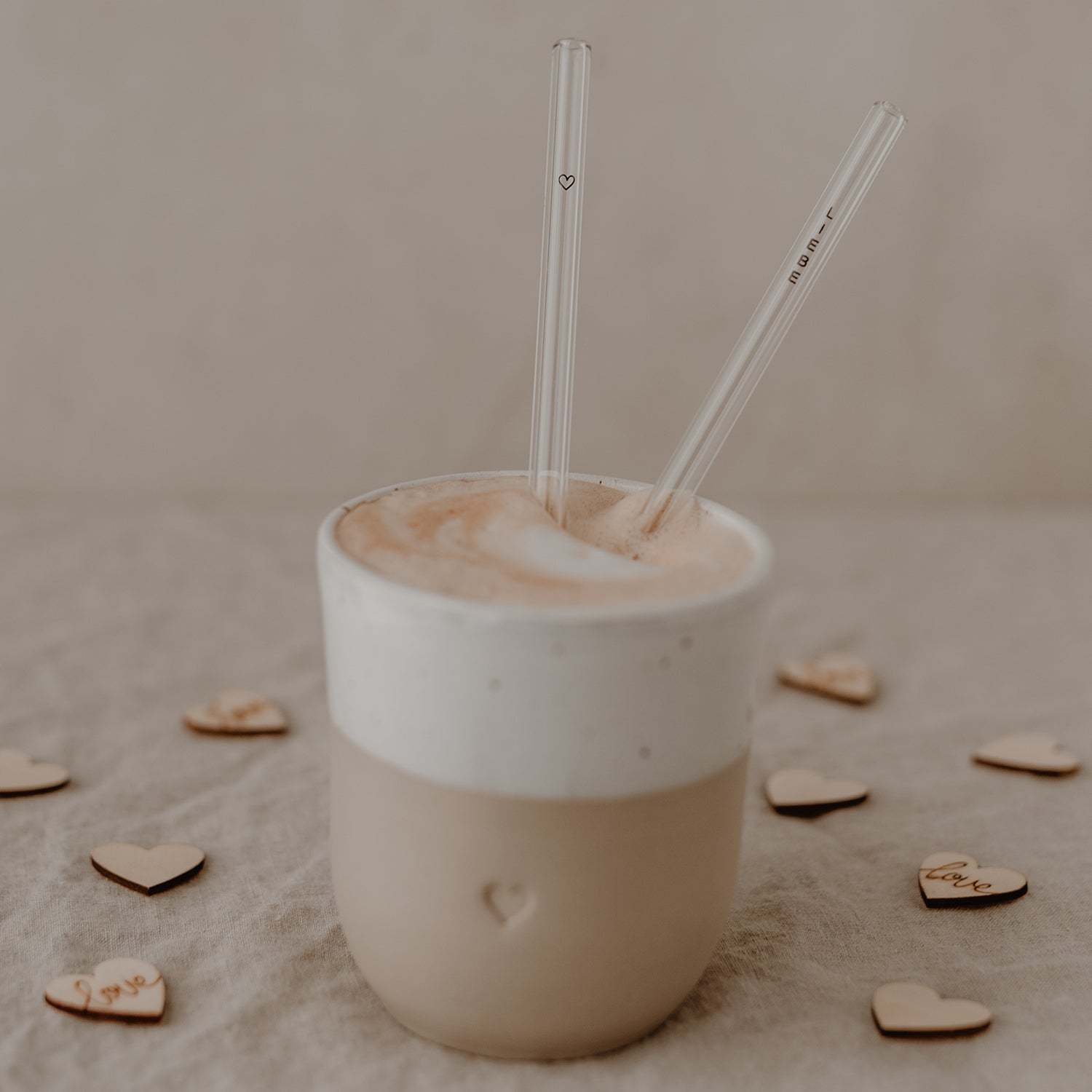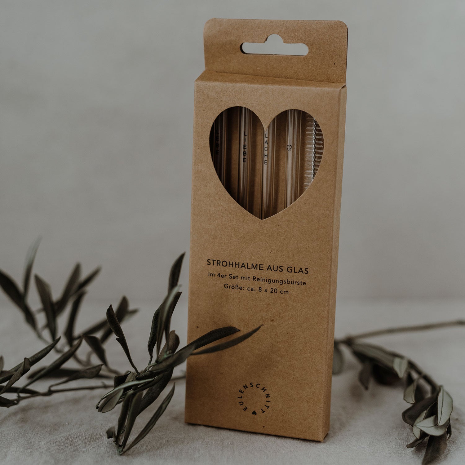 Der Strohhalme „Lebe Liebe Lache“ aus Glas von Eulenschnitt sind die nachhaltige Alternative zu Einweg-Plastikstrohhalmen. Hitzebeständig und robust, bringen sie Stil und Freude in jedes Getränk.