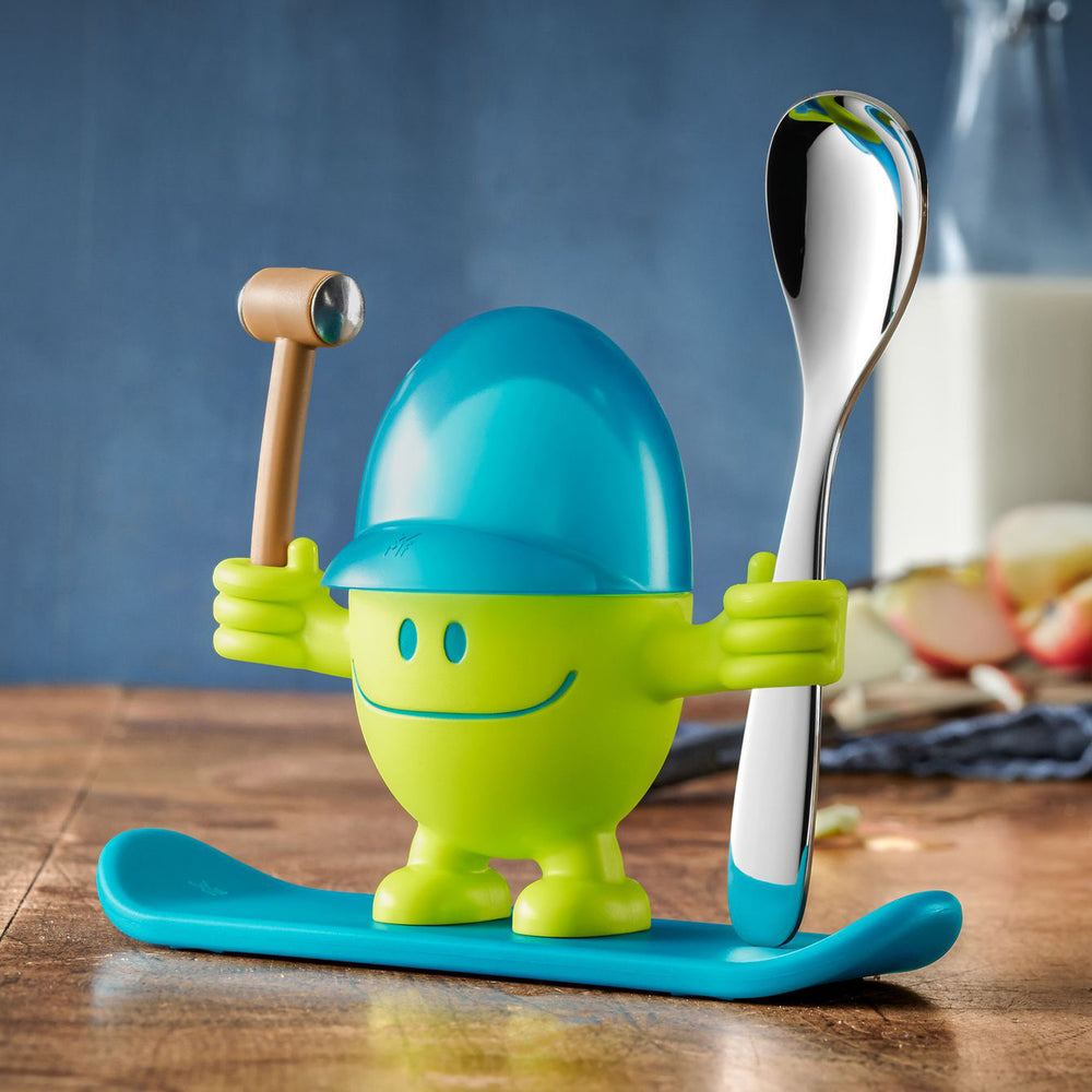McEgg, der fröhlich-bunte Eierbecher von WMF, ist bereit, direkt auf den Frühstückstisch zu surfen und für Spaß zu sorgen! Mit einem freundlichen Grinsen hält McEgg das gekochte Ei sicher fest, während es genüsslich aus der Schale gelöffelt wird. Doch bevor das Ei genossen werden kann, gibt es den lustigen Teil mit McEgg: das Aufschlagen der Eierschale. Einfach das abnehmbare Hämmerchen verwenden, um die Schale zu knacken, und dann die Schale in der ausklappbaren Baseballkappe verstauen – und los geht's!