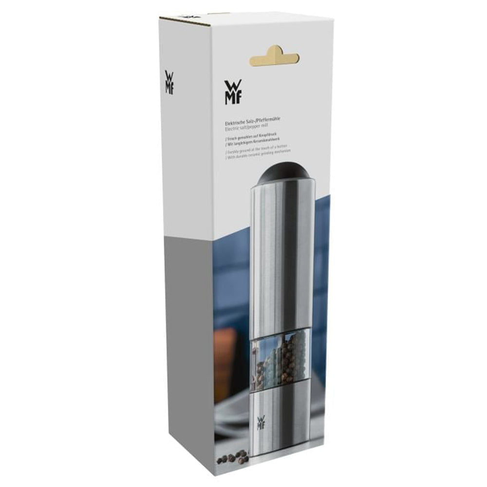 Mit der elektrischen Gewürzmühle von WMF wird das Würzen und Verfeinern von Salz, Pfeffer und aromatischen Gewürzen zum mühelosen Vergnügen. Ausgestattet mit einem exklusiven Keramikmahlwerk, das mit einer Garantie von 10 Jahren* versehen ist, bietet sie Härte, Lebensmittelneutralität sowie Verschleiß-, Korrosions- und Abriebfreiheit. Die stufenlose Einstellung des Mahlgrades ermöglicht eine präzise Anpassung der Körnung von grob bis fein.