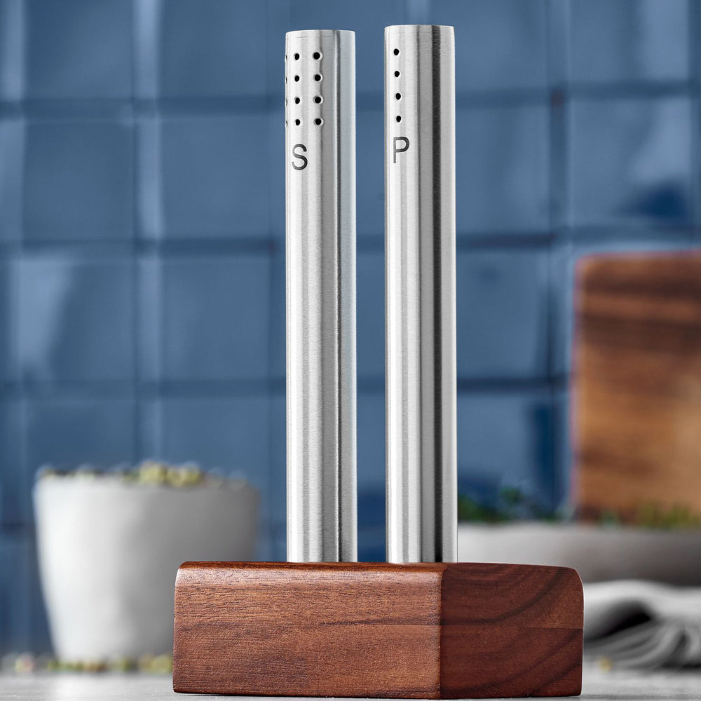 Die beiden schlanken, eleganten Türme aus mattiertem Cromargan®: Edelstahl Rostfrei 18/10 stehen wie Kunstwerke auf ihrem edlen Sockel aus Akazienholz. Das WMF Salz- und Pfefferstreuer-Set besticht durch seine einzigartige Kombination aus pflegeleichtem, hochwertigem Material und praktischer Funktionalität.