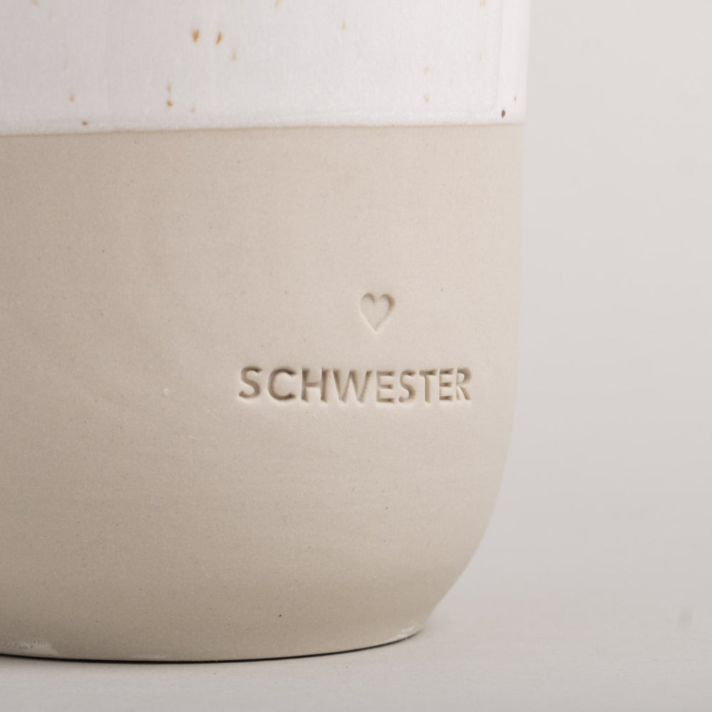 Jeder Becher strahlt Individualität aus, da Ton und Glasur ihre einzigartige Note verleihen. Durch die Handfertigung entstehen Unterschiede in Drucktiefe, Höhe und Geradlinigkeit. Wir sind verliebt und voller Freude, diese Kollektion bald in euren Händen zu sehen! Unser Becher "Schwester" ist das perfekte Geschenk für jede "Schwester" eine Hommage an die Einzigartigkeit und Liebe, die er verdient.