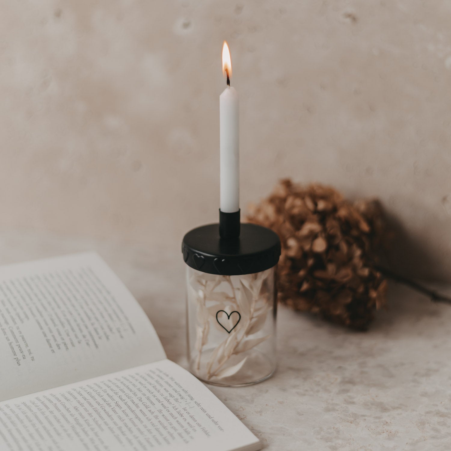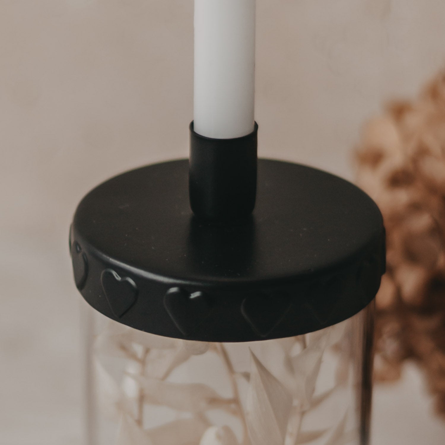 Verwandle dein Mini-Vorratsglas in ein stimmungsvolles Kerzenglas! Der schwarze Kerzenhalter von Eulenschnitt mit zarten Herzprägungen passt perfekt auf Gläser mit 6 cm Durchmesser und eignet sich ideal für Tannenbaum-Kerzen.