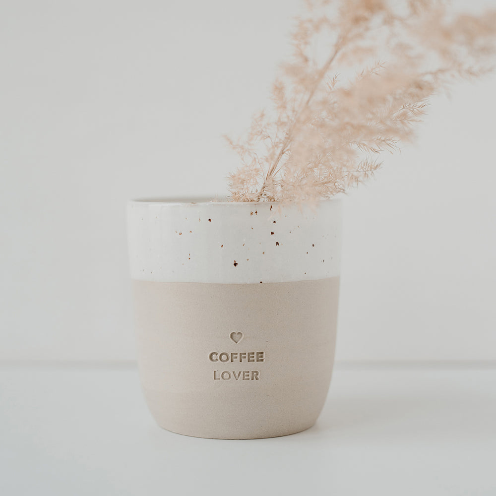 The manual production, Firing, embossing, grinding, glazing and re-firing every cup one unique depth, height and Character. The minimalist design and natural color nuances are achieved by a blind embossing "Coffee Lover" We are excited and looking forward to our collection in your hands!