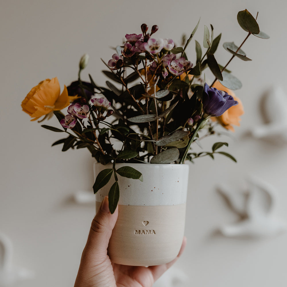 Every cup shines individuality because clay and glaze have their unique The handcrafting process creates differences in print depth, height and straightness. We are in love and full of joy to see this collection in your hands soon! Our mug "Mama" is the perfect gift for every mother, a tribute to the uniqueness and love she deserves.