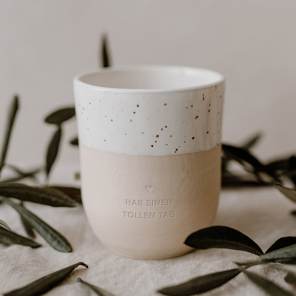 The manual production, Firing, embossing, grinding, glazing and re-firing each cup one unique depth, height and Character. The minimalist design and natural color nuances are achieved by a blind embossing "Great Day" We are excited and looking forward to our collection in your hands!