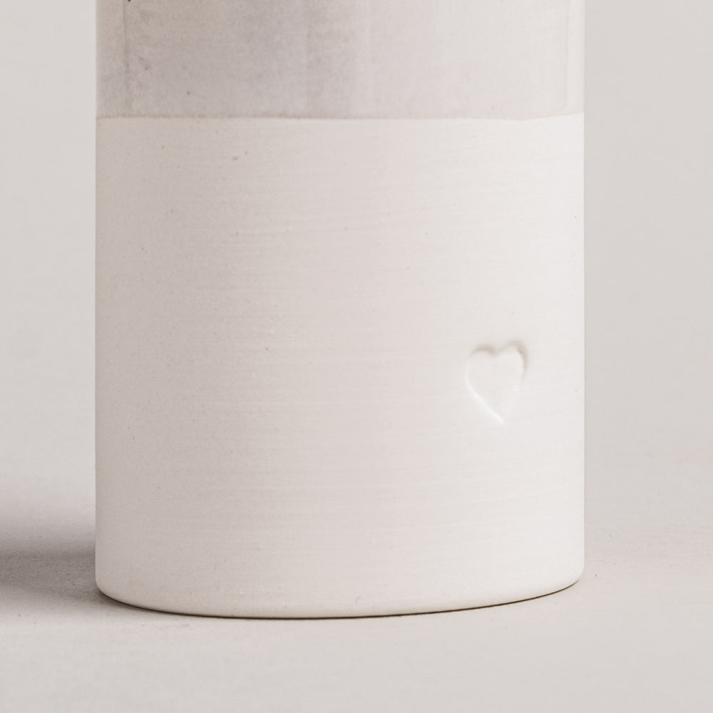 Der Steingutton besticht durch ein wundervolles natürliches Weiß und wird durch unsere spezielle Glasur mit kleinen braunen Tupfern vollendet. Das ganz besondere Etwas bekommt die zylindrische und schlichte Vase durch die wundervolle Herzprägung.