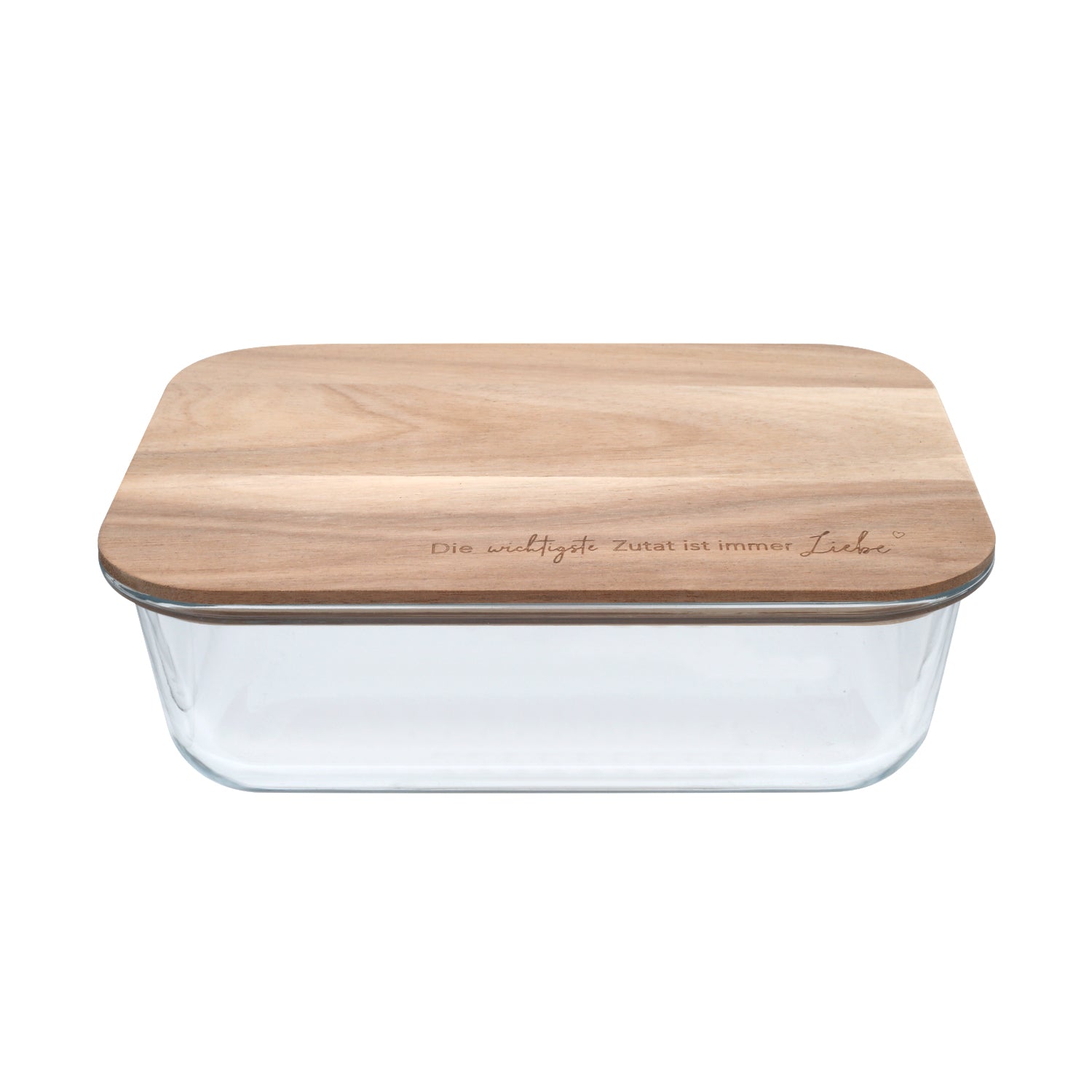 Our storage containers made of high-quality borosilicate glass enchant with elegance and functionality. Each glass impresses with its quality and durability. The acacia wood lid, artfully decorated with a heart, gives each container a personal touch.