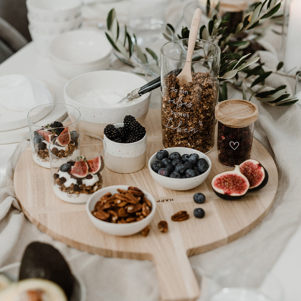 Our storage jars made of high-quality borosilicate glass impress with their aesthetics and functionality. With the inspiring lettering "Such a sweet, colorful life" they give every kitchen a special touch. The acacia wood lid, decorated with our motto "Confetti for the soul" and Eulenschnitt logo, is a unique piece that radiates naturalness and individuality.