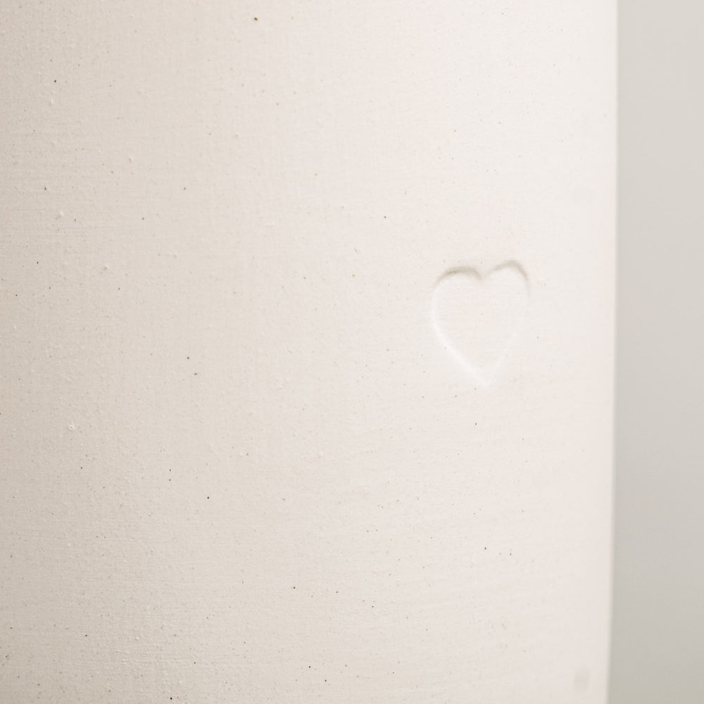 Der Steingutton besticht durch ein wundervolles natürliches Weiß und wird durch unsere spezielle Glasur mit kleinen braunen Tupfern vollendet. Das ganz besondere Etwas bekommt die zylindrische und schlichte Vase durch die wundervolle Herzprägung.